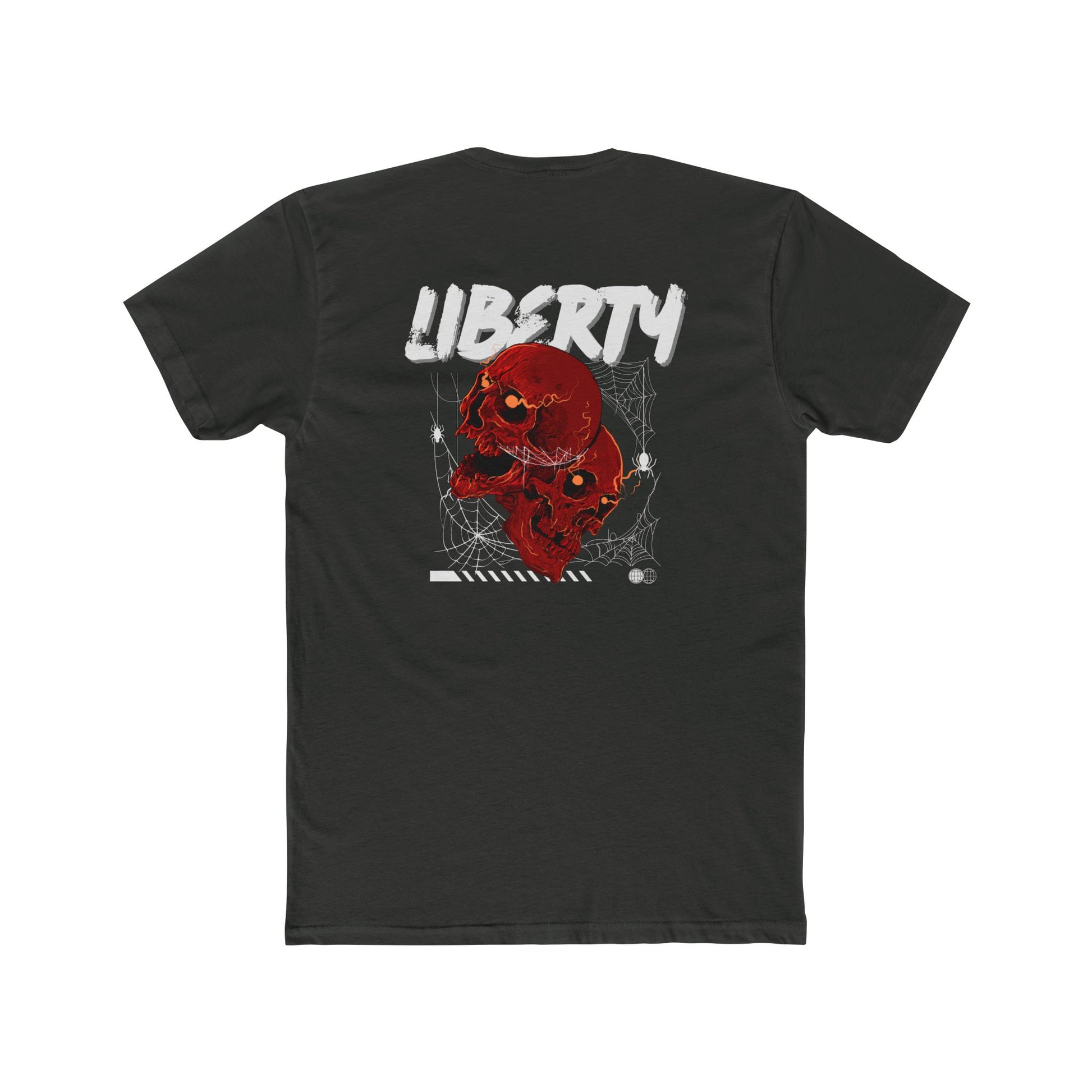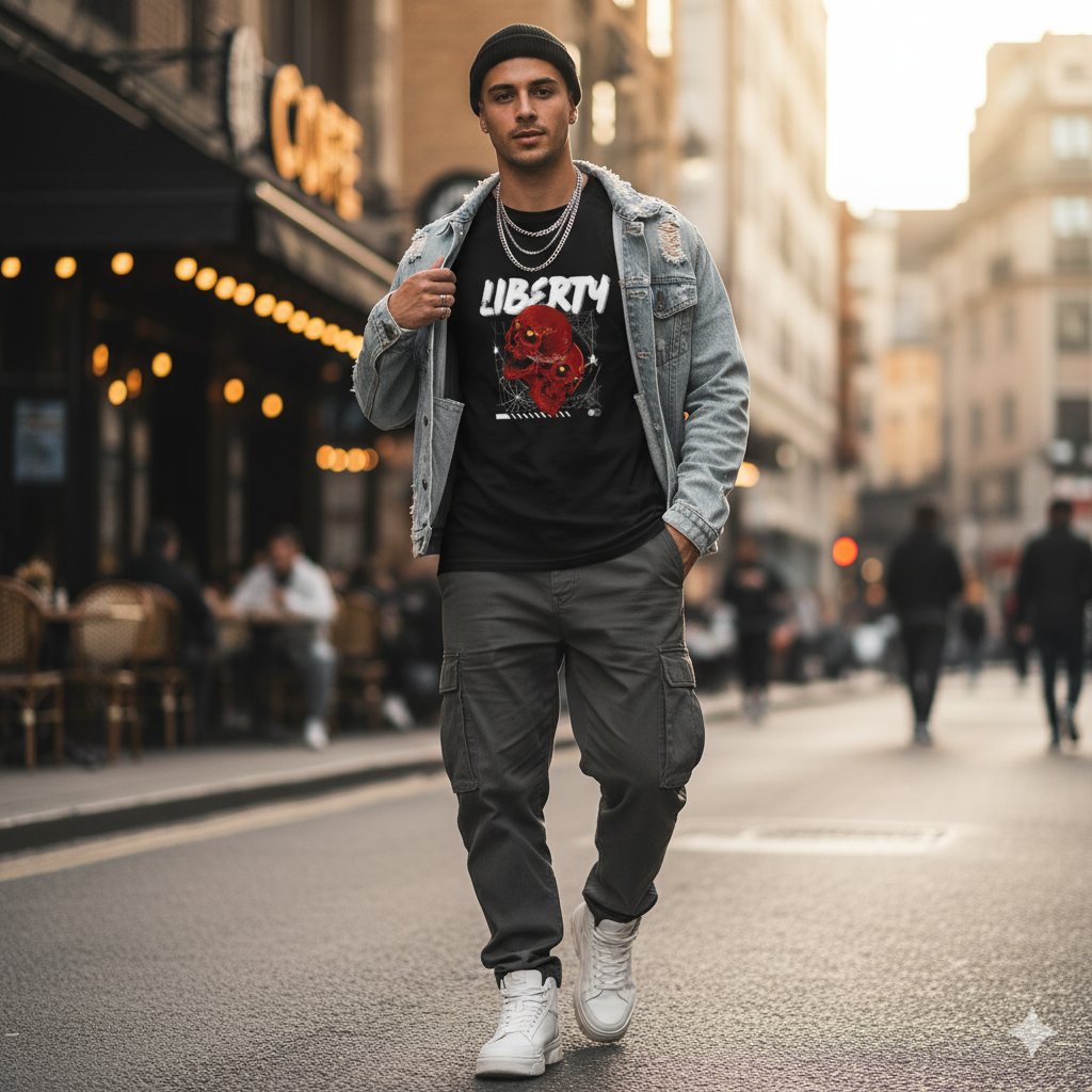 The Liberty Skull T-Shirt exudes a rebellious and edgy vibe, perfect for those who appreciate alternative fashion. This versatile tee is ideal for casual outings, concerts, and festivals. It appeals to adults looking to stand out with unique graphic tees, especially for Halloween and alternative music events.